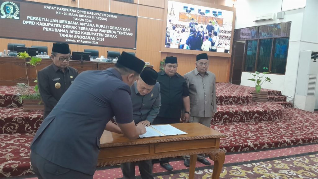 Demak, Tren24reportase.com – Dewan Perwakilan Rakyat Daerah (DPRD) Demak menggelar Rapat persetujuan bersama antara Bupati Demak dan DPRD Kabupaten Demak terhadap Rancangan Peraturan Daerah (Raperda) tentang perubahan APBD Kabupaten Demak tahun anggaran 2024 di ruang rapat paripurna DPRD Kabupaten Demak, Jawa Tengah. Senin- (12-8-2024).