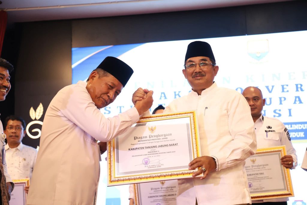 Jambi, Tren24reportase.com – Pemerintah Kabupaten Tanjung Jabung Barat kembali menorehkan prestasi membanggakan dengan meraih peringkat kedua se-Provinsi Jambi. Penghargaan atas capaian tersebut diterima oleh Bupati Tanjung Jabung Barat, Drs. H. Anwar Sadat, M.Ag, dari Pemerintah Provinsi Jambi pada kegiatan penilaian kinerja pelaksanaan 8 Aksi Konvergensi Penurunan Stunting tahun 2025 yang berlangsung di Auditorium Rumah Dinas Gubernur Jambi. Rabu (2/7).