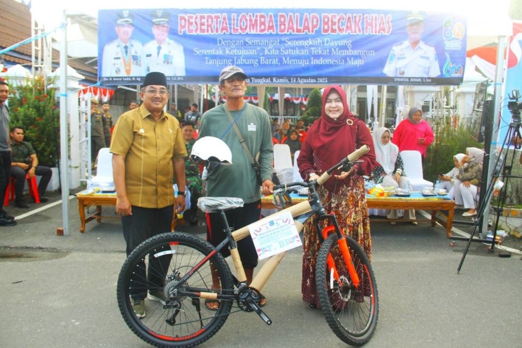 Tanjab Barat, Tren24reportase.com – Bupati Tanjung Jabung Barat, Drs. H. Anwar Sadat, M.Ag., didampingi Ketua TP-PKK Kabupaten Hj. Fadhilah Sadat, menyaksikan secara langsung kemeriahan lomba balap becak hias yang digelar di depan Rumah Dinas Bupati dalam rangka perayaan Hari Jadi ke-60 Kabupaten Tanjung Jabung Barat dan HUT ke-80 Kemerdekaan RI Tahun 2025, Kamis (14/8).